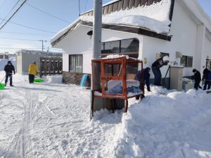 玄関前の通路を広げる作業を主に行い、屋根から落ちて堆積した雪をスノーダンプで運び出しました。
